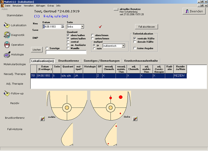 Diese Seite ist der Ausgangspunkt für die Dokumentation. Für die visuelle Kennzeichnung lassen sich Tumore einzeichnen. Weiterhin werden hier die Angaben zur Brustkonferenz, Studien und den Krankenhausaufenthalten dokumentiert.